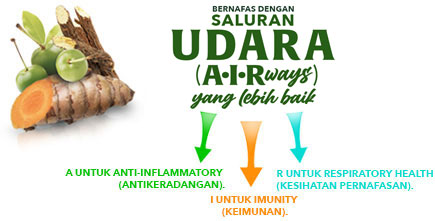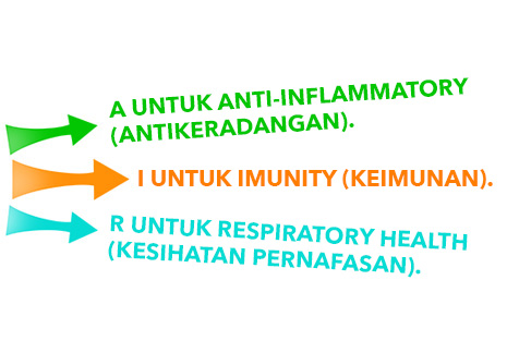 Ia disimpulkan kepada tiga aspek. Anti-inflammatory (Antikeradangan), Imunity (Keimunan) dan Respiratory Health (Kesihatan Pernafasan). Secara ringkas, AIRways (Saluran Udara) anda. Sistem imun adalah penjaga yang mencegah kuman, virus dan organisma berbahaya daripada memasuki dan mengganggu badan anda. Bagaimanakah anda melindungi keimunan anda? Dengan memastikan badan anda mengambil bahan-bahan yang mengandungi fungsi antikeradangan dan meningkatkan kesihatan pernafasan.